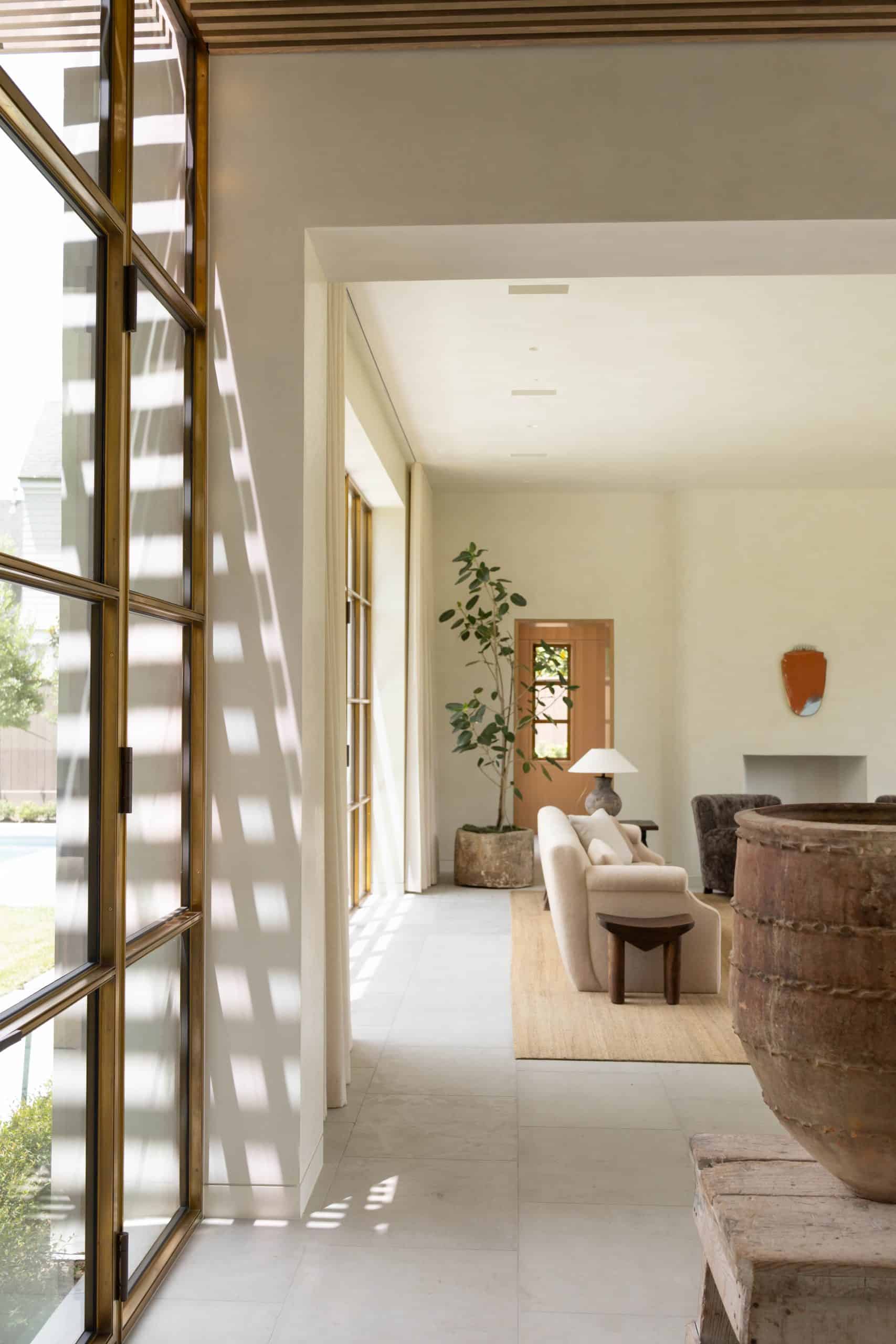 The first floor consists almost entirely of rooms for entertaining with access to exterior play and gathering spaces. The Living Room faces both street and pool courtyard and takes natural light from matching north and south facing windows. The bar west of the Living Room has French doors to access back yard and pool directly. The Dining Room opposite the Living Room is the northernmost room of a suite of rooms that includes stair, powder, Kitchen, Family, Mudroom and garage. Service rooms connected end to end on the east form a path that compliments the west circulation shaded by an accoya trellis.